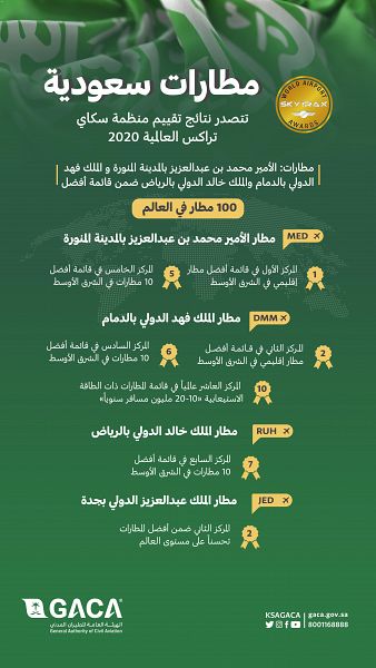 واحتل كل من مطار الأمير محمد بن عبدالعزيز الدولي بالمدنية المنورة ومطار الملك فهد بن عبدالعزيز الدولي بالدمام ومطار الملك خالد الدولي بالرياض على مراكز عالمية متقدمة ضمن أفضل 100 مطار عالمياً.