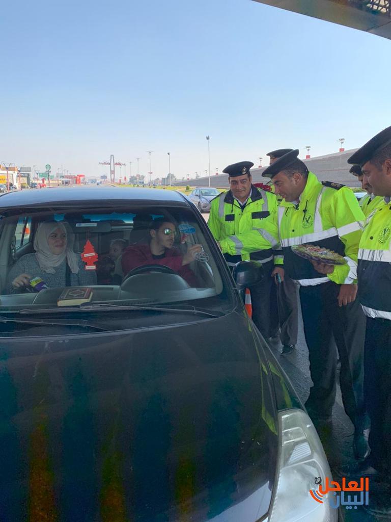 بالصور.. إدارة المرور توزع الورد علي المواطنين بالطرق السريعة للتفاعل بين الشرطة والمواطنين